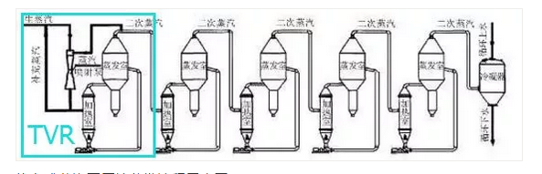 熱力蒸氣再壓縮蒸發根據熱泵原理,生蒸汽經過文丘里蒸氣噴射式熱泵,以少量高壓蒸汽為動力將部分二次蒸汽壓縮并混合后一起進入加熱室作加熱蒸汽用。