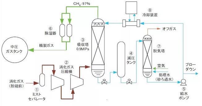 消化氣體在在0.9Mpa左右的中壓環(huán)境下和循環(huán)水接觸,消化氣體中硫化氫被水吸收,形成純度97%以上的甲烷氣體,可作為城市天然氣使用。該項技術(shù)在神戶和上田等地已經(jīng)建設(shè)投入使用。